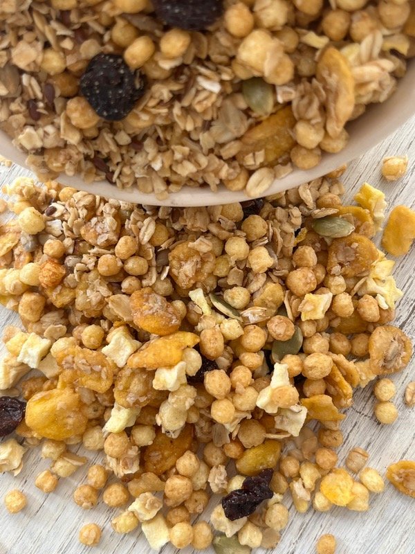 Esta granola trae quinoa inflada, copos sin azúcar, avena, almendras, mani sin sal, mix de semillas, zapallo, manzana deshidratada, pasas negras, pasta de maní y Mascabo.