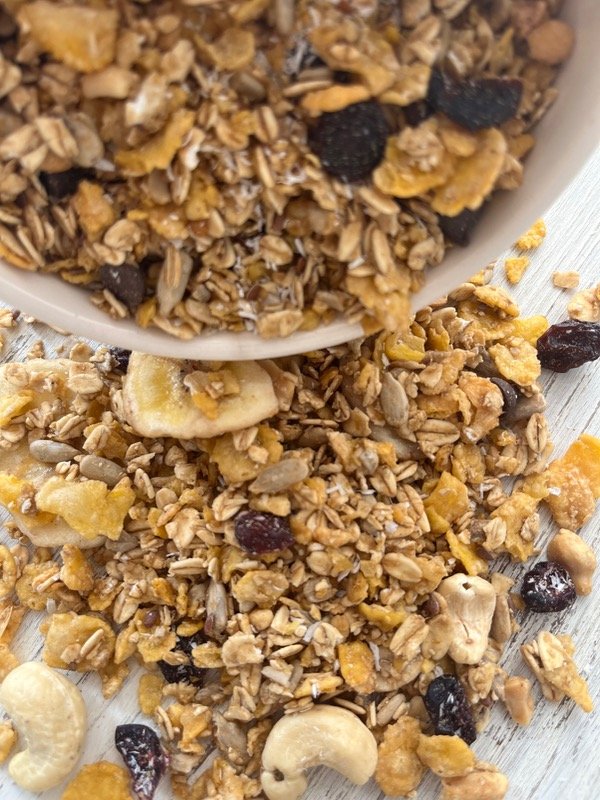 Granola Tropical: avena, maní sin sal, mix semillas, almendras, copos sin azúcar, cajú tostado, coco rallado, banana, pasas negras.